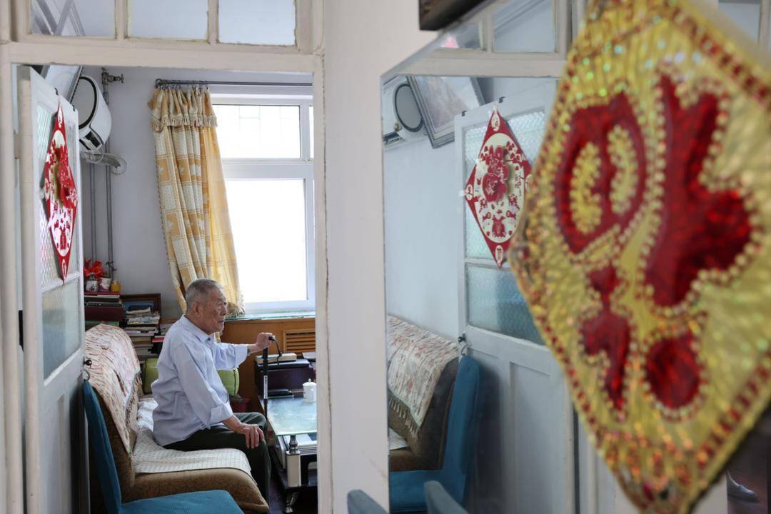 今年97岁的宫健,由子女每天轮班照顾,采访当天,在家的是他的女儿宫荣荣和宫萌萌。宫荣荣告诉记者,现在的父亲像个“老小孩儿”,“智能手机用得特别好,主要是看新闻,看不清就听,每天都得看很久。”